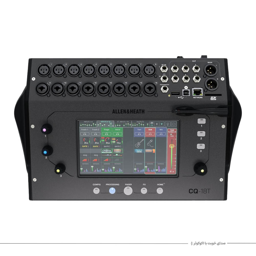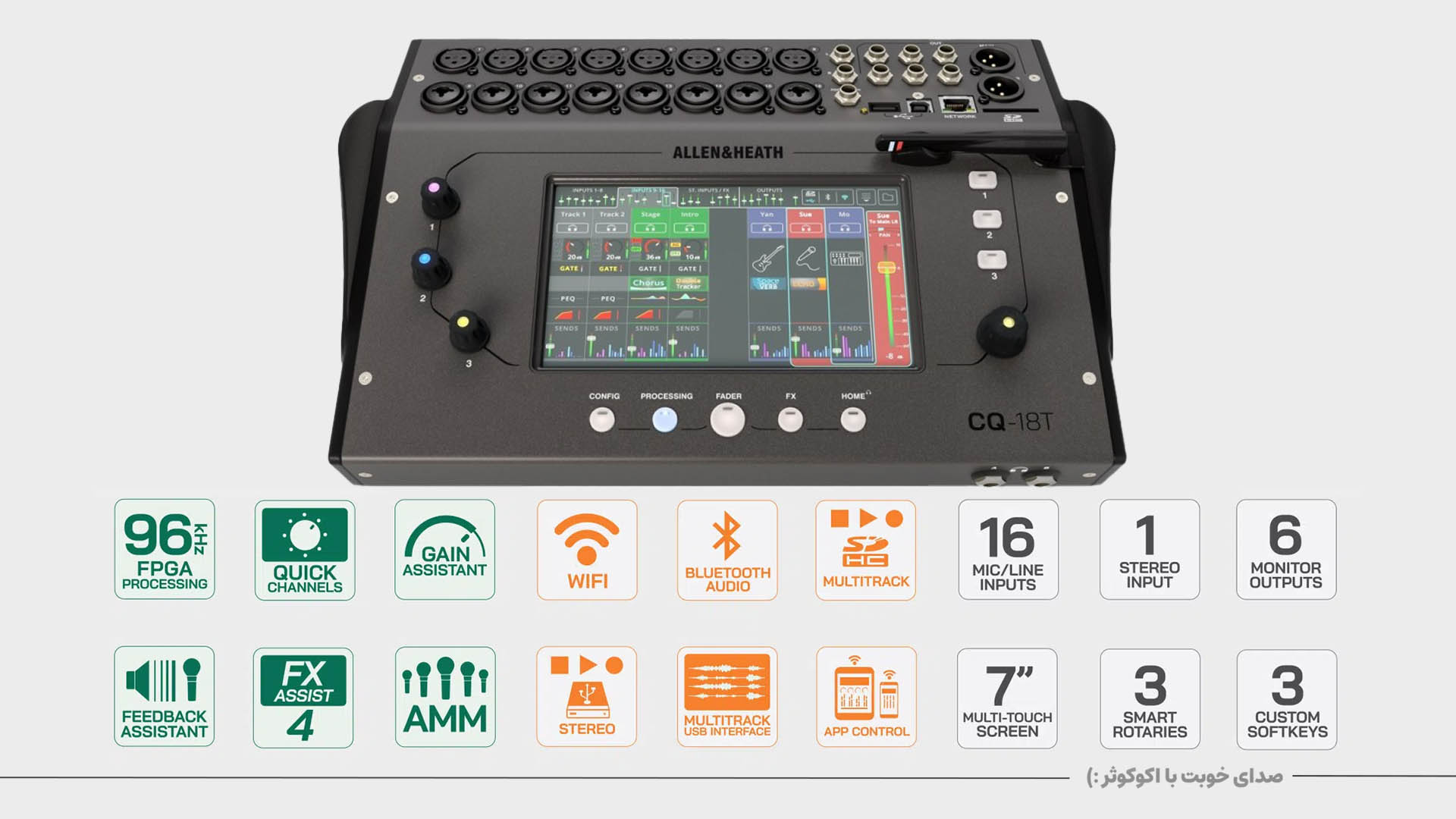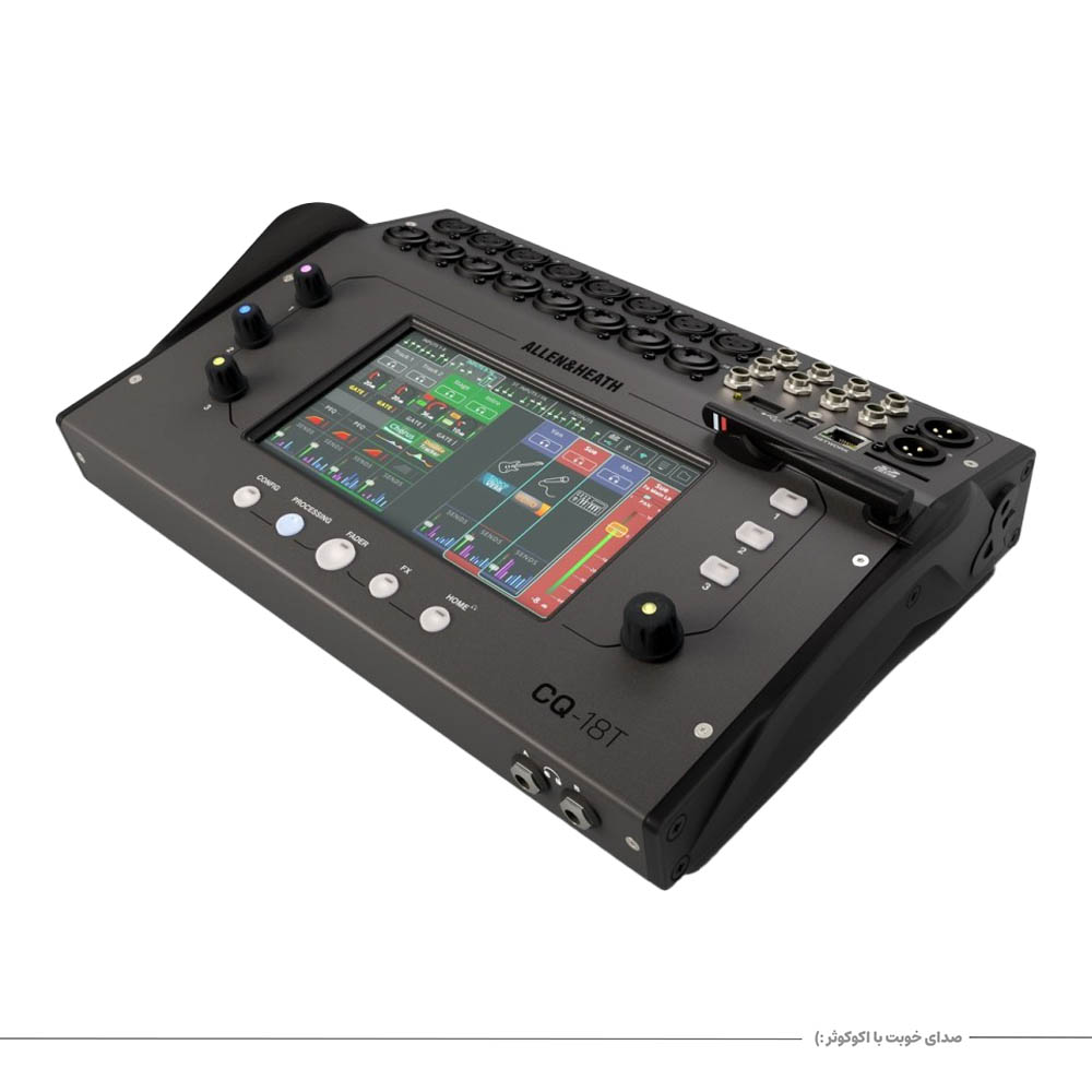 Allen & Heath CQ18T یک میکسر دیجیتال جمع و جور است که کیفیت صدای استثنایی و تطبیقپذیری بالایی را به کاربران در مراسمات مذهبی یا موسیقی ارائه میدهد. این میکسر با موتور پردازش ۹۶ کیلوهرتز، صدایی عالی را برای سیگنالهای ورودی و افکتهای داخلی خود فراهم میکند. CQ18T طیف گستردهای از گزینههای اتصال، از جمله بلوتوث، وایفای دو بانده و ضبط و پخش صدای SD و USB را ارائه میدهد. این میکسر به یک صفحه نمایش لمسی خازنی ۷ اینچی و ناب کنترل چرخشی مجهز شده است تا امکان پیمایش و کنترل آسان ویژگیها و تنظیمات برای کاربران فراهم باشد. علاوه بر این، CQ18T دارای دو اپلیکیشن کنترل مختلف است CQ-MixPad و CQ4You برای کنترل کامل و میکس برای مهندسان صدا هر دو اپلیکیشن با دستگاههای ویندوز، مک، اندروید و iOS سازگار هستند.