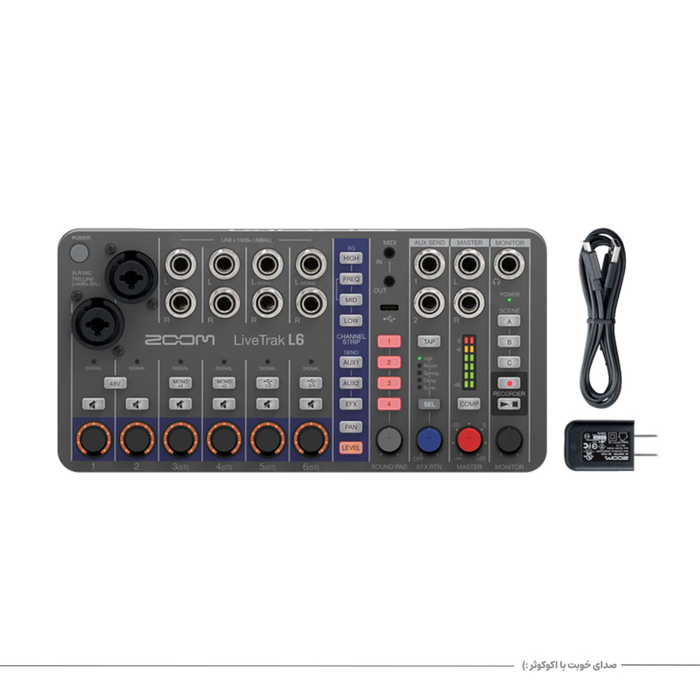 LiveTrak L6 فشرده ترین و قابل حمل ترین میکسر/ضبط دیجیتال کمپانی زوم است. اجازه ندهید اندازه آن شما را فریب دهد. L6 با قابلیت های میکسر بزرگ طراحی شده است 10 کانال ورودی ( 2 ورودی XLR برای میکروفن و 4 ورودی استریو برای اتصال انواع ساز و دیوایس های استریو )، افکتور با 4 پریست، ورودی و خروجی MIDI و 4 پد صوتی قابل برنامه ریزی طراحی شده است همچنین LiveTrak L6 می تواند به عنوان یک کارت صدای USB با 12 ورودی و 4 خروجی برای اتصال به رایانه، iOS یا دستگاه اندرویدی نیز استفاده شود و در حین ضبط همزمان روی کارت microSD به عنوان کارت صدا استفاده شود